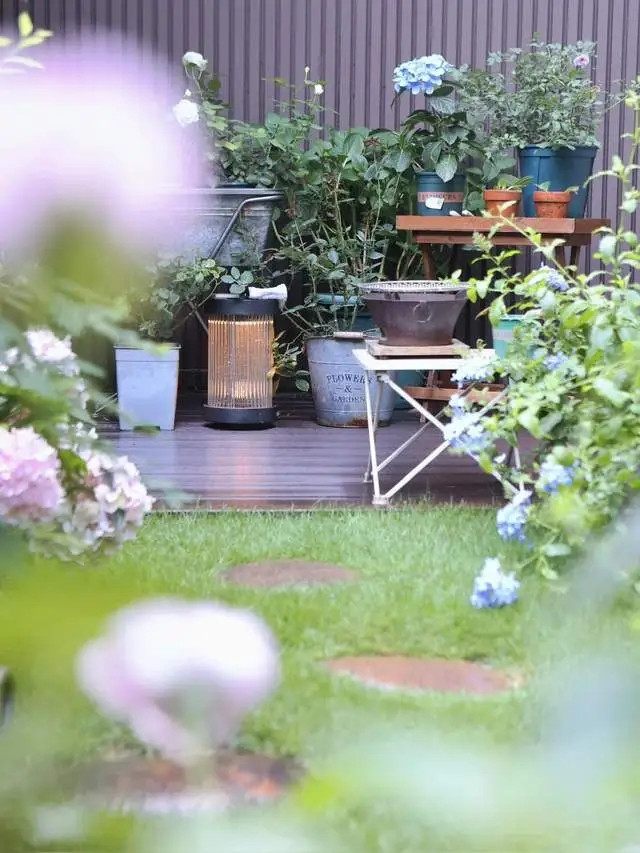 用旧砖块砌成的花坛、废弃木箱改造成的多肉架、邻居扔掉的铁桶——这些简单的材料,通过她的巧思拼搭,变成了一个个充满故事的小角落。