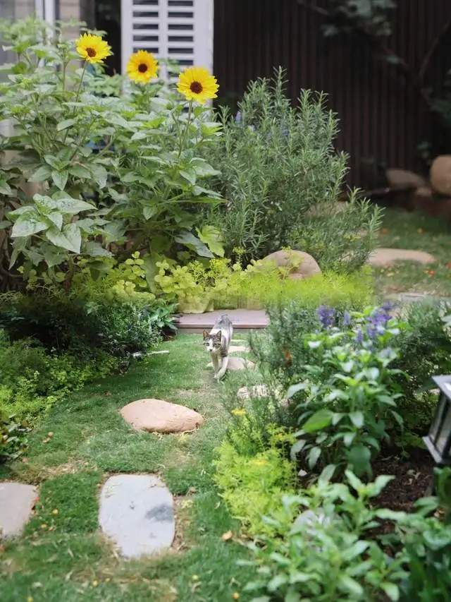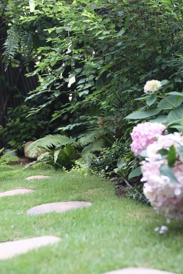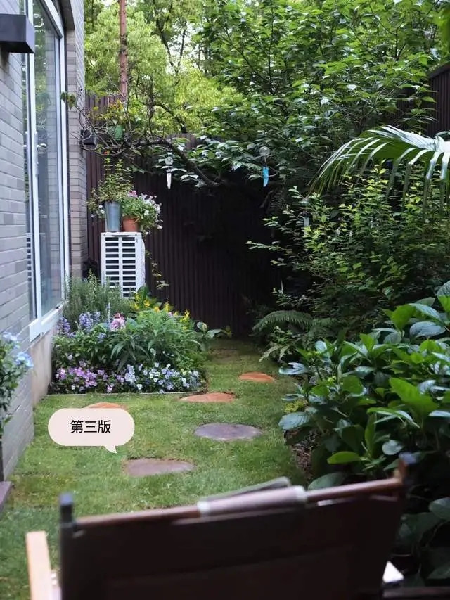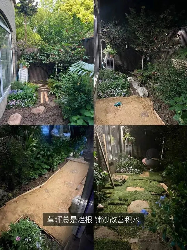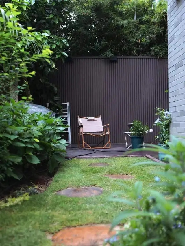 剩下的地方拆除了硬化地面,回填土壤,铺上草坪,并搭配丰富的绿植和水景,让整个院子逐渐变得充满生机与趣味。